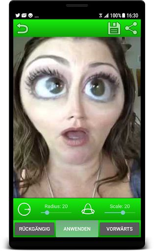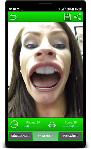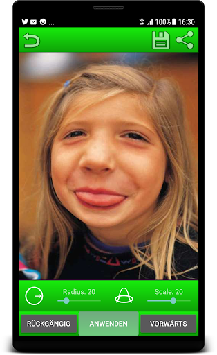 Change now your or your friends Face to funny Grimace with Face Warp Grimace Maker App. Easy touch the positions you want to curve and change with the sliders the intensity of the effect. Save your creations and watch it in your Gallery.