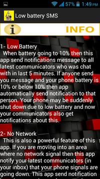 When your battery is going to 10% then this app sends a notification message to all the latest communicators who you chatted with within the last 5 minutes. If anyone sends you a message and your phone battery is 10% or below 10%, then this app automatically sends a notification to those persons.Your phone may be suddenly shut down due to a low battery and now your communicators will also get notifications about this.