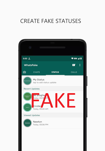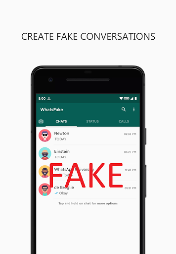 Create fake chats, status and calls. Create fake chat conversations and fool your friends. Fake Chat lets you create realistic mocks of chat conversations and share it with your friends. Create Whats Prank contacts and conversation and have fun with your friends and family.