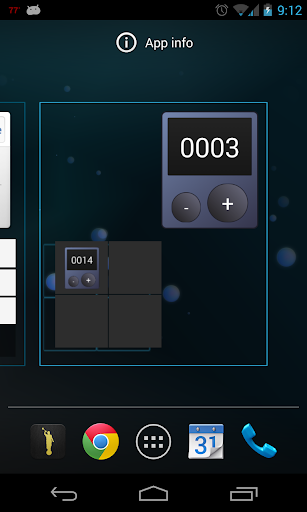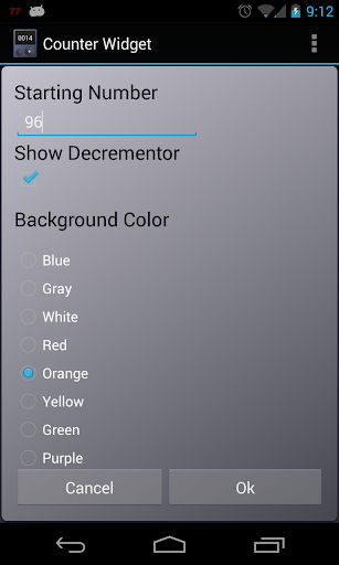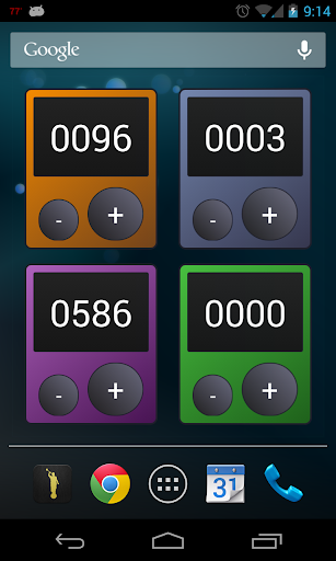 A simple counter widget that you can attach to your home screen. Configuration options include 8 different colors, the ability to select the starting number, and whether to show or hide a decrementor button. Also allows you to add multiple counters at once to keep track of different things.