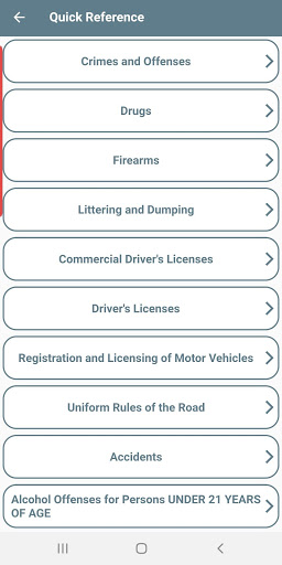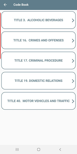 The app allows law code sections to be looked up manually by Title, Chapter, and Article, or you can also search the law codes by using our handy and convenient search feature.