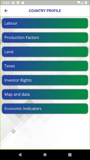 - a country profile that details about the country's labor, production factors, land, taxes, investor rights, and economic indicators.