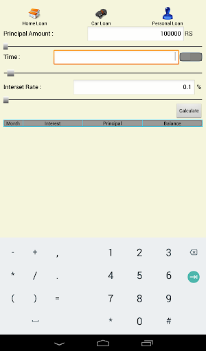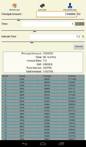 This App is support all size and all version of android device * app calculate home loan, car,personal loan etc ** withlist of moths with emi of that month ***with 99�curacy