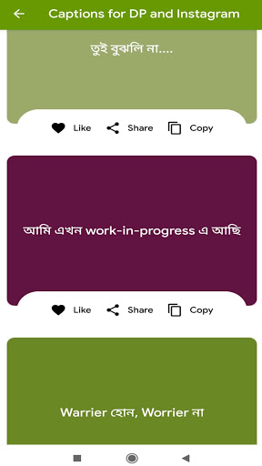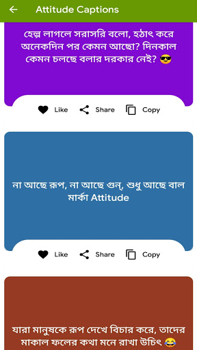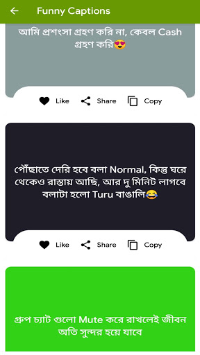 Express your thought with this unique Bangla Captions and Status App 2021. There are thousands captions and status in English or Hindi, but very limited resource in Bengali. In this App, we bring the best Bengali Captions, Status and Quotes for you. You can write perfect status in Instagram, Facebook or WhatsApp wherever you want. You can reach us for more categories and Captions through comments or email Id given at the end.