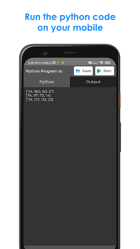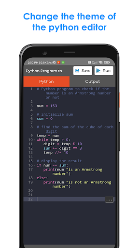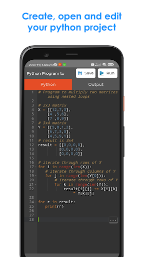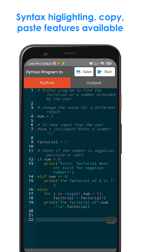 Python IDE is the best mobile app to edit and run the python codes easily. It even supports numpy module. It is much faster than other applications to edit Python Codes on mobile. Its User-Interface is pretty good and clean. Users can work both in day and night times. The users have to write their codes in Python code section. Then, the user should click on the run button. The output of the code will be displayed in the Output Section. The best Python IDE for beginners and intermediates.