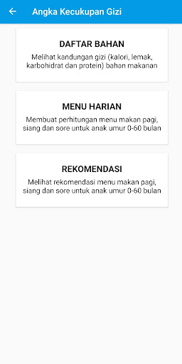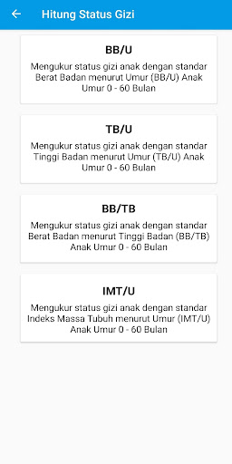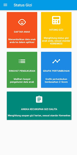 Aplikasi ini berguna untuk mengecek status gizi anak anda, berdasarkan standar hitung gizi, yang berupa BB/U, TB/U, BB/TB, IMT/U. Aplikasi ini juga berguna untuk mengetahui kandungan kadar gizi dari daftar menu makanan, rekomendasi menu makanan. Anda juga dapat melihat riwayat pengecekan gizi anak anda setiap bulannya.