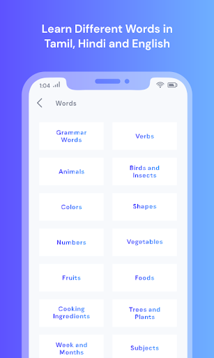 - English to Hindi or Tamil or Hindi Trainer app, each option provides you all the basic necessary things needed to learn Hindi from basic level such as Alphabets, Category wise Words and Sentences.