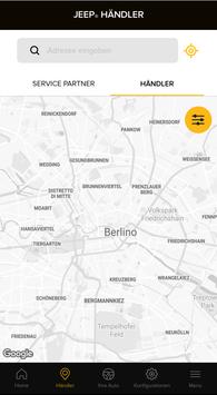 Lassen Sie sich dank der Geolokalisierung alle in Ihrer Nähe befindlichen Händler und Werkstätten von Jeep® und die Routen zu ihnen auf der Karte anzeigen.