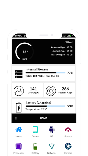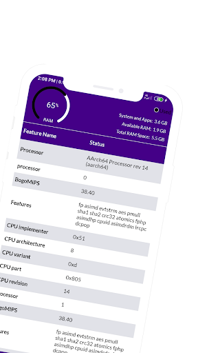 It detects the cpu, RAM, motherboard chipset and other hardware features of your Android smartphone and presents the information in simple view.