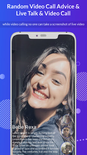 Random Video Call Advice & Live Talk & Video Call application with high demand for sharing all your secrets with any peoples. our application ensure each other to sharing your emotions with using live video chat. it's safe to use to start to chat with them in a secure environment.