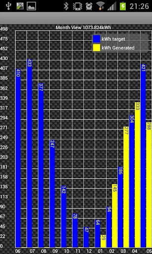 Historical monthly totals (kwh) bar graph with ability to show comparison to monthly targets.