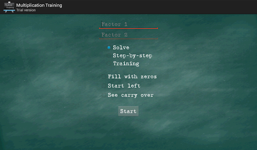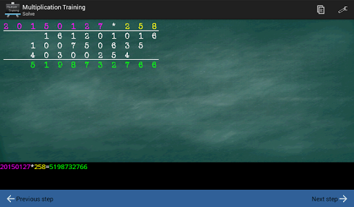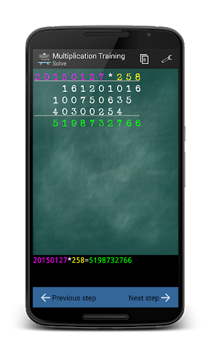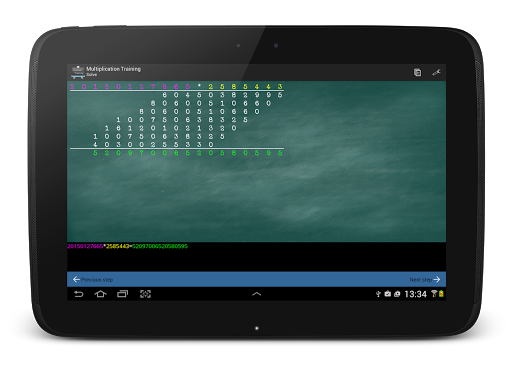 mode, each single step of the multiplication is explained and illustrated. The numbers involved in the current step are highlighted and explained.