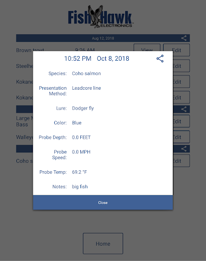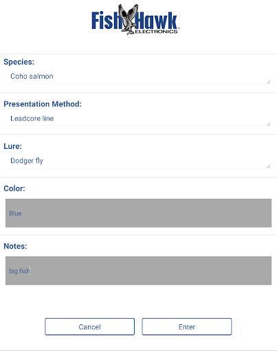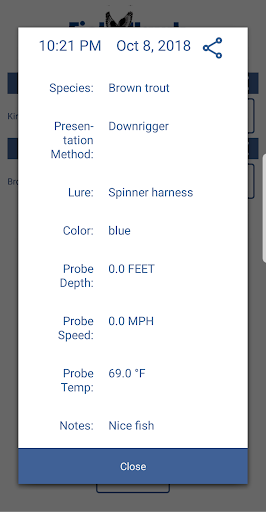 This app features a Catch Log that lets you quickly record the species, size, presentation method, lure, color and probe depth, temp, and speed every time you catch a fish.