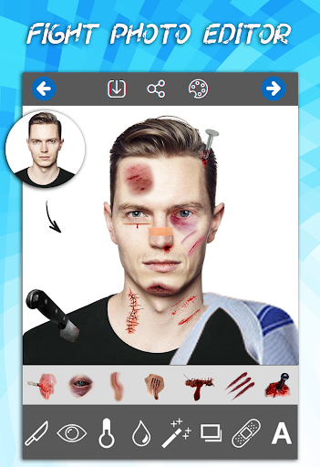 Wound Photo Editor is to set Fight sticker on your body photos and make your looks scary. Fight Photo Montage is a photo editor app that offers you a variety of Fight Face to add to your photos and give a virtual makeover to your face in a second.