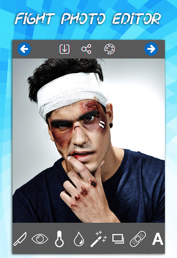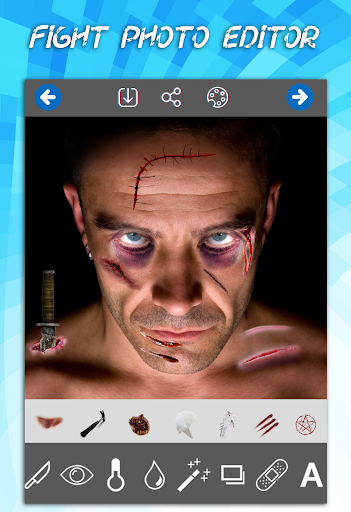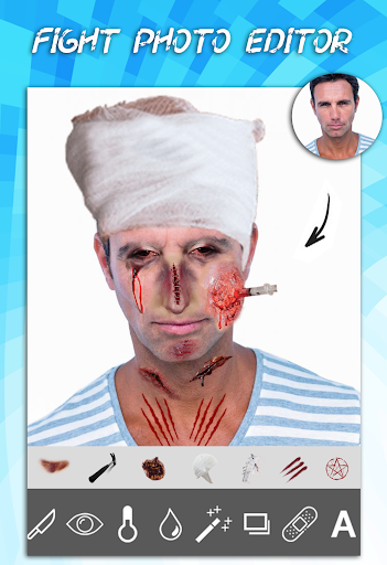 Injured App in Which best "Fight Photo Editor Prank: Battle Effect Montage" to create real fight battle face photo! Add Stickers (bloody wounds, bruising, blood sprays and fight blood) on photo easy and free with awesome Fight Battle Face Photo Editor!