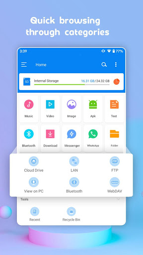 - Categorize files into image, APK, video, music, document, archive, favorite, and new files
