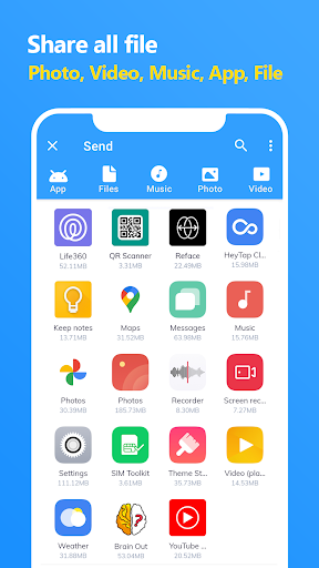 - Support Transfer file and Receive file all types (Photos, videos, music, apps and ect).