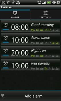 Alarm 4u is an alarm clock application with many unique features. With Alarm 4u, you won’t have trouble waking up on time or falling back asleep. Choose from one of the waking methods such as shaking the device, solving an equation, or simply sliding a button. Gentle wake up feature wakes you up slowly by increasing the alarm volume and the vibrating frequency. If you want to snooze, you can simply flip your device upside down. If you accidentally fall back asleep after dismissing your alarm, Alarm 4u will check if you are awake in one minute. Choose any picture to be displayed on the alarm waking screen so that you may start your day reminded of the ones you love, family, friends, nature, or a favorite car … You can use the picture as a reminder of what not to forget. When you are adding a new alarm, all you need to do is to set a time. All other settings are copied from your default configuration. Alarm 4u includes many animations, and smooth interaction. You can delete an alarm by simply sliding it out of the screen.
