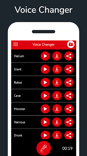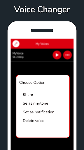 Your voice will change according to chosen sound effects. You can save converted voice effects in the memory of your phone, on SD card or share it with your friend via popular social portals (amount of applications which you can use to share your voice sound effects depends on amount of applications installed on your phone, which are able to support audio files as attachments).