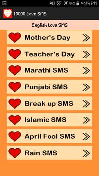 Love,romantic,Valentine,Cute,Kiss,Friendship,love hindi,Sorry,Status,Morning,Night,Nice,Politics,SMS Jokes,Eid,Exam,Women's Day,New Year,Wife,Husband,Birthday,Cricket,Smile,Father's Day,Mother's Day,Teacher's Day,Marathi sms,Punjabi sms,Break-up,April fool,Rain,Good luck,anniversary.