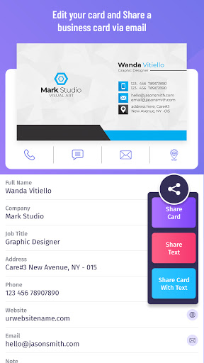 Share your digital card by e-mail with just one tap and additionally share your card image and card text with friends and families.