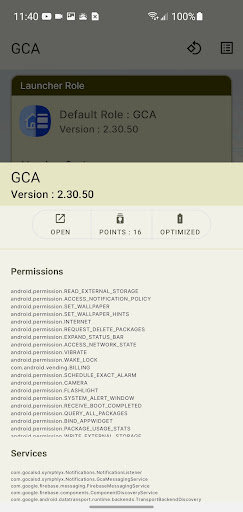 -Describes version info, permissions, activities and services used by the default launcher in use.