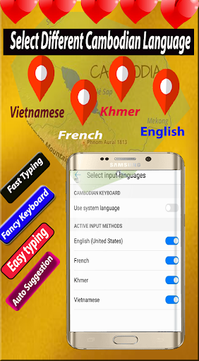 You no need to install different keyboards for Khmer language , Vietnamese language and French language, just download Cambodian Keyboard : Mulit Language Keyboard and enjoy 4 in 1 keyboard typing, Khmer keyboard, French keyboard, Vietnamese keyboard and English typing witch smart setting options. Cambodia keyboard contains Khmer dictionary , Vietnamese dictionary and French dictionary with auto words suggestions.