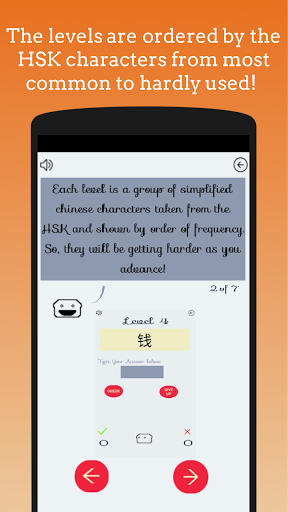 In this first version, the app has over 500 hanzi (characters) for you to pactice your reading skills, ranging from HSK1 to HSK3. They were separated in 25 levels, ordered by the most frequent character, meaning the most used and easy to identify, to the least frequent.