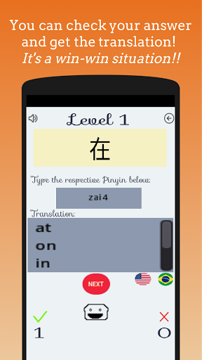 In order to further help you with your learning, as a bonus, each time you check your answer, the character’s translation to English will be shown (and also, if you’re interested, in Portuguese) and, in case you get it wrong or just don’t know it, you’ll also be able to see the correct answer. With it, you will be able to view your stats and try again, to keep improving your skills.