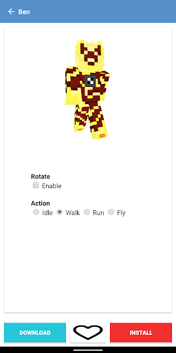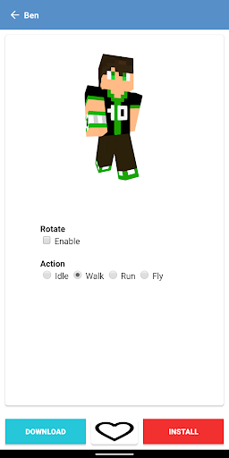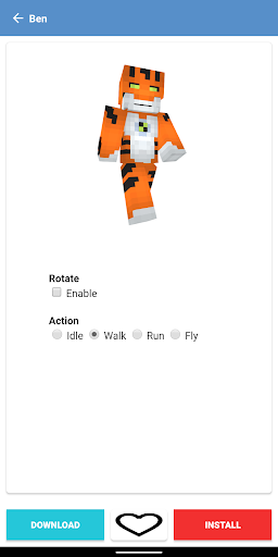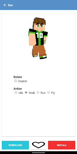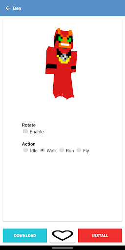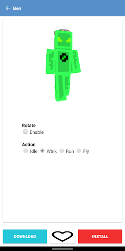 Ben Skins for Minecraft has a simple interface that makes it easy for anyone to use. Install Ben skin for Minecraft PE and enjoy the gameplay. With just one button, you can already use your favorite Ben skin. Press the download button to save the skin to memory, or press the install button to directly use the skin into the game.