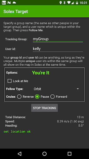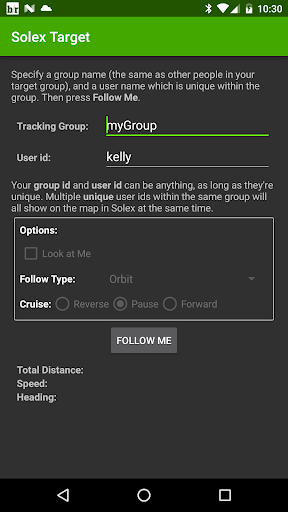 Specify a group and user name, press Follow Me, and go. Then Solex can see your movements, and send a 3DR Solo copter to film you while you ski down a mountain, ride a motorcycle around, drive a car around a track, etc.