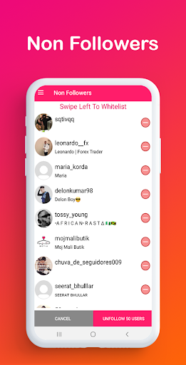 With Unfollow for Instagram, you can easily find a list of all users who do not follow your account on instagram but whom you follow. While tracking non-followers, the app also lets you unfollow these users. You can either unfollow a single user or unfollow multiple users. So, if you are asking yourself - Who unfollowed me on instagram?, just start using this Unfollow for Instagram to find out who unfollowed you. This app does not increase your followers on instagram. It only tracks users who do not follow you back on instagram and allows you to unfollow them.