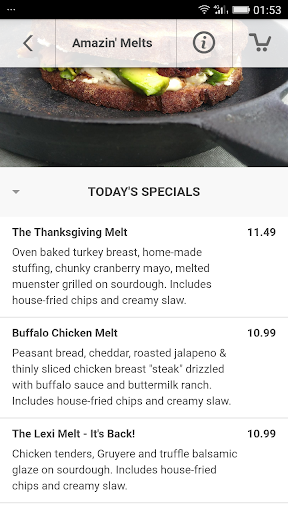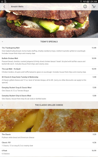 - The full Amazin' Melts menu offers all your favorite specials, signature melts, classic & soup deals, build your own melts, sides & dessserts.