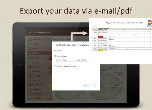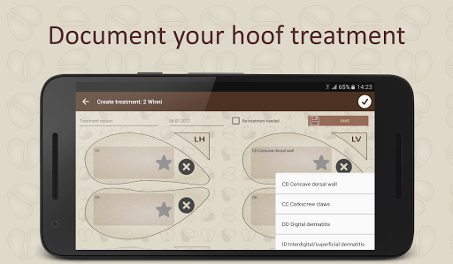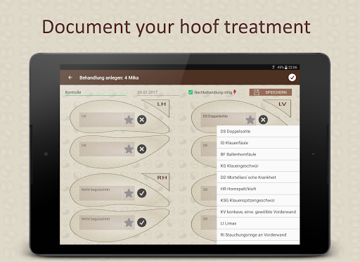 The included database is saving all information entered about the care work. In addition the database memorizes the expression of the treatments and the notes which will be provided in a drop-down list for future documentation. Furthermore the official appellation of several of the most common hoof disorders can be adjusted to the drop-down menu. This simplifies the input considerably and allows the personalization of the app for each user.