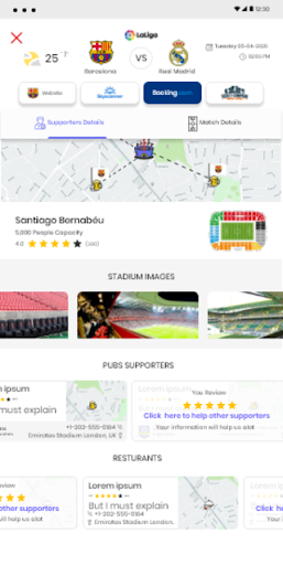 Tap on “Supporter Info” if you want details about a certain match. See “Match Details” such as the current standings of the two selected teams and their last 5 games. Then go to “Supporter Details” to see the stadium location, the experience of other football fans that already visited the stadium, find local pubs, local places to eat and see reviews. You can also compare and book flights, find and book accommodation for the match date all within our football fans app!