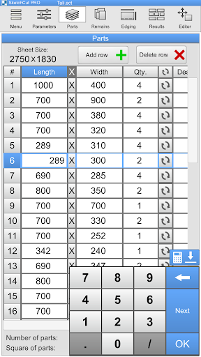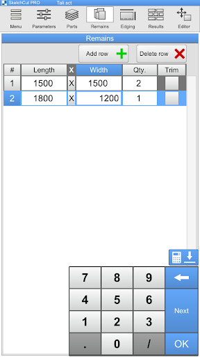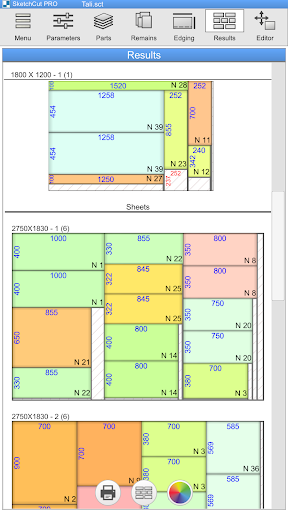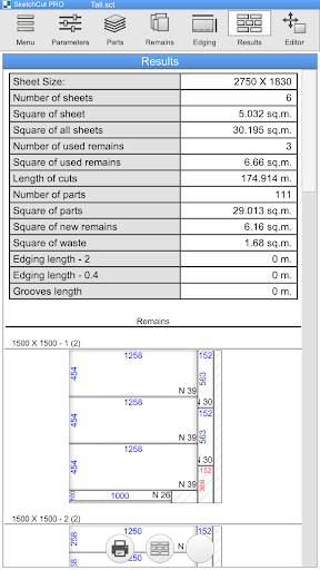 This app takes into account the specific characteristics of cutting sheet materials (laminates, MDF, plywood, glass, plastic, chipboard, etc.) either manually or on a cutting machine.