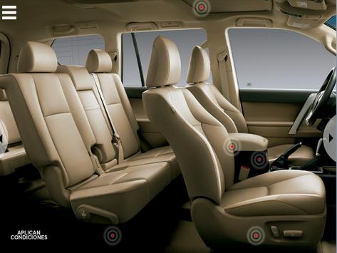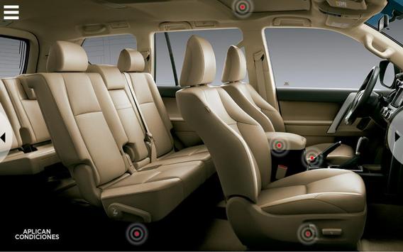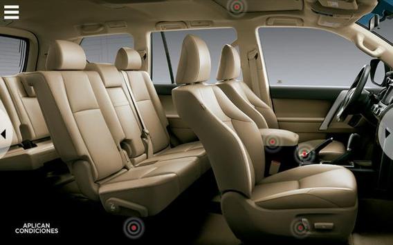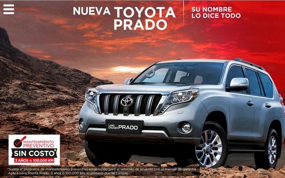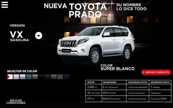 Con esta aplicación podrás explorar la camioneta preferida por los colombianos, la nueva Toyota Prado, que ha logrado que su nombre lo diga todo. Podrás encontrar la historia de cómo ha alcanzado la supremacía mundial en vehículos virtualmente indestructibles, interactuar con su comodidad y versatilidad desde el interior hacia afuera, y hasta cotizar tu próxima Toyota Prado.