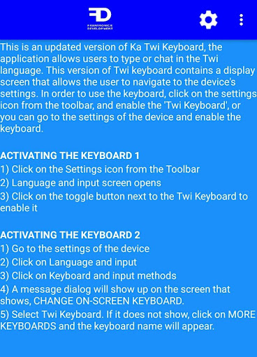 This keyboard is the updated version of Ka Twi Keyboard, with some added functions such as the smile emoji and a home screen to show the steps required in getting the keyboard working on a mobile device.