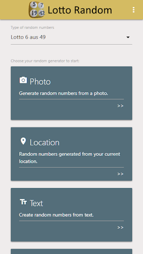 This program helps you to generate numbers for Lotto 6 aus 49, Eurojackpot, Lotto 6 aus 45, PowerBall and SuperEnalotto. You can use a photo, your current GPS location or choose a location anywhere in the world to use as base for your random numbers. The generated number of the same photo or location will always be the same.