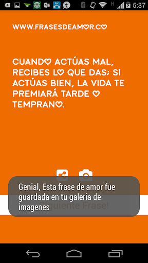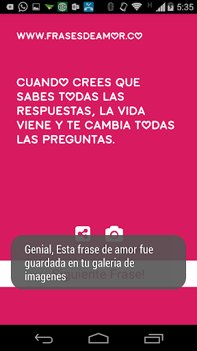 Simplement, rapide et très jolie, vous aurez des phrases aléatoires sur l'amour que vous pouvez convertir en chulas ou en phrases à envoyer via WhatsApp, texte ou publier directement sur votre mur.