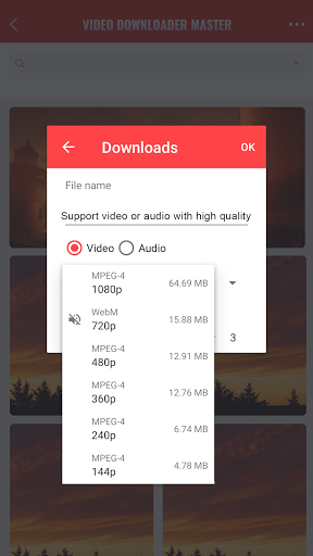 Video Downloader Master is an utility that allows you to download files from many web sites directly into yours device, so that you can open them every time you want saving internet traffic.