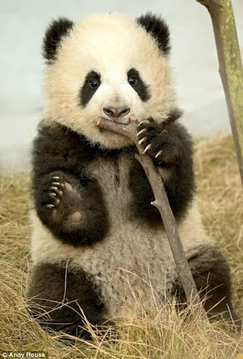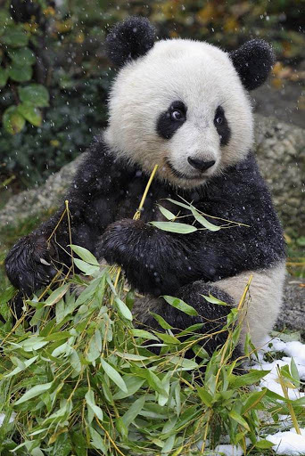 The giant panda (Ailuropoda melanoleuca, literally "black and white cat-foot"; Chinese: 大熊猫; pinyin: dà xióng māo, literally "big bear cat"), also known as panda bear or simply panda, is a bear native to south central China. It is easily recognized by the large, distinctive black patches around its eyes, over the ears, and across its round body. The name "giant panda" is sometimes used to distinguish it from the unrelated red panda. Though it belongs to the order Carnivora, the giant panda's diet is over 99% bamboo. Giant pandas in the wild will occasionally eat other grasses, wild tubers, or even meat in the form of birds, rodents, or carrion. In captivity, they may receive honey, eggs, fish, yams, shrub leaves, oranges, or bananas along with specially prepared food.