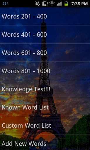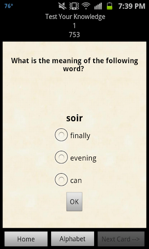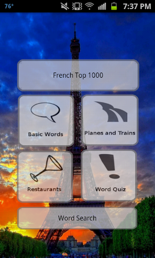 Easy French is a 4-in-1 application. You’ll study the 1000 most used French words, but also find the dictionary like search feature useful for finding one word in particular. After you’ve learned a few words, check out the quiz to further reinforce your learning or even take the knowledge test to see how fluent you are! Maybe you just want to learn a phrase or two for your next trip? There are useful travel phrases in a separate section, food and restaurants also, and a basic words category to learn some everyday phrases to use in shops, homes, public places or with new friends.