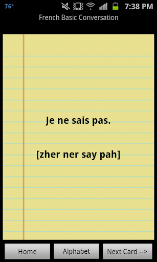 This stylized French language learning tool uses flash cards and phonetic alphabet reference to teach basic French words and phrases. Flashcards include English pronunciation equivalent for easy self-study. Categories include: