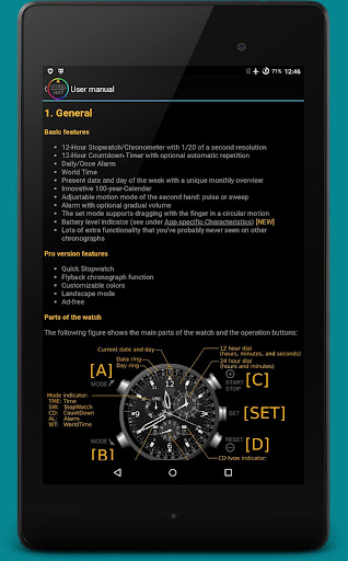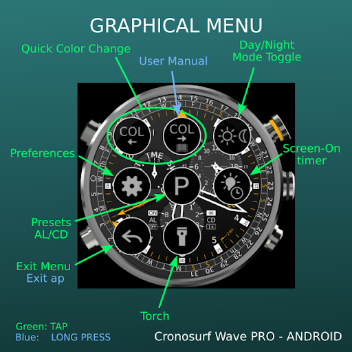 Since Cronosurf has many features, the app includes a comprehensive user manual. The Button Assistant is now integrated in the app (portrait mode). Use it for quickly getting familiarized with the basics. To activate it, tap on the area above the watch.