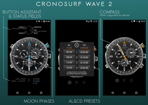 Cronosurf Wave is a chronograph watch app for Android devices and a watchface for Wear OS.