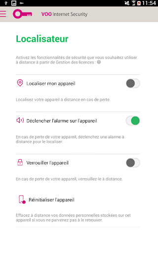 L’application nécessite un accès aux droits d’administration de l’appareil pour fonctionner et VOO utilise ces autorisations en totale conformité avec les politiques de Google Play et le plein consentement de l’utilisateur final. Les autorisations d'administrateur de périphérique sont utilisées pour activer les fonctionnalités de Finder ou contrôle parental, en particulier :