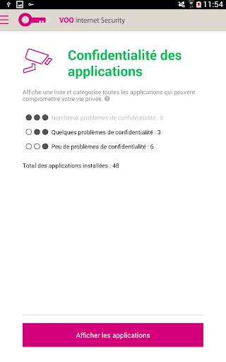 VOO Internet Security protège votre confidentialité de multiples façons, notamment grâce à l'antivirus et à la protection de la navigation qui vous protègent des applications et pages Web malveillantes. Antitheft préserve la sécurité des données stockées sur votre appareil. La confidentialité de l'application vous aide à identifier les applications susceptibles de nuire à votre confidentialité.