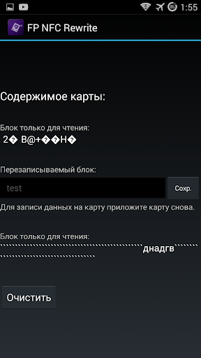 Приложение позволит Вам записать текстовые данные в некоторые защищённые от записи метки Mifare Ultralight.