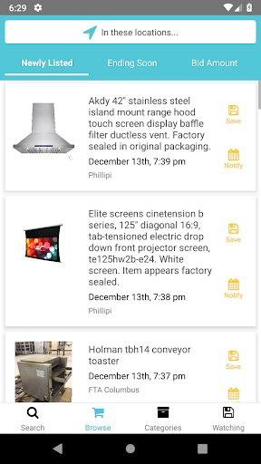 FTA Search includes a full text search engine for searching the entire database of items available on BidFTA. You can search, filter by location, and sort by relevancy or items ending soonest.